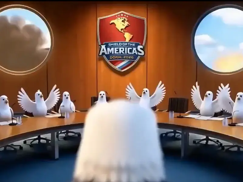 The 18-second animation depicts a bald eagle wearing a suit presiding over a group of white doves symbolising Latin American countries.
